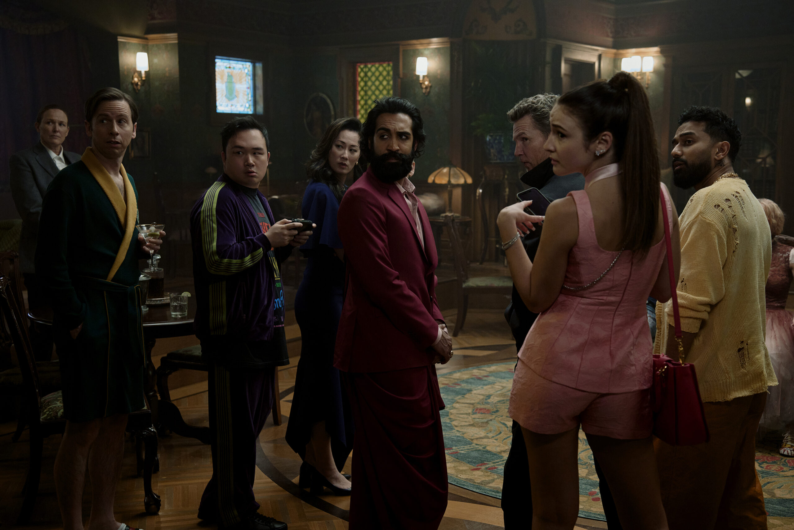 From L to R: Kara Wooten, Daniel Beirne, Antony Hall, Olivia Cheng, Nadeem Umar-Khitab, Shawn Hatosy, Maša Lizdek, and Varun Saranga in READY OR NOT 2: HERE I COME. Photo by Searchlight Pictures/Pief Weyman, Courtesy of Searchlight Pictures. © 2026 Searchlight Pictures. All Rights Reserved.